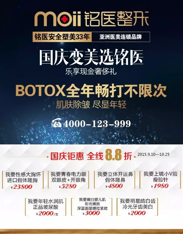 国庆变美选铭医,乐享现金奢侈礼!正值中秋、国庆双节期间,铭医整形感恩回馈,想爱美者之所想,解爱美者之所需,首创BOTOX全年畅打卡。作为东北地区医学美容的龙头品牌,铭医整形时刻引领东北整形美容新风潮,让你一卡在手全年无皱!