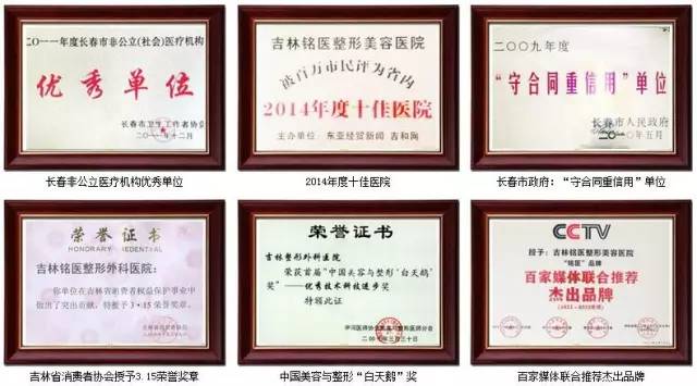 吉林铭医整形美容医院多年来荣获:长春非公立医疗机构优秀单位;年度十佳医院;守合同重信用单位;吉林省消费者协会3.15荣誉奖章;中国美容与整形白天鹅奖;百家媒体联合推荐杰出品牌……等一百余项荣誉称号。