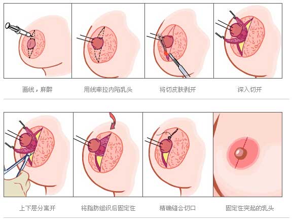 重度乳头凹陷,乳头完全埋在乳晕下方,用非手术的方法无法使内陷乳头挤出,进行手术矫正是好的方法。矫正手术要求医生要有极强的责任心,术中要仔细分离和切断乳腺管间的纤维束,正常情况下,不会损伤乳头的感觉神经,故术后不会妨碍乳头的正常感觉,手术一般不破坏乳腺导管,所以也不会造成哺乳障碍。